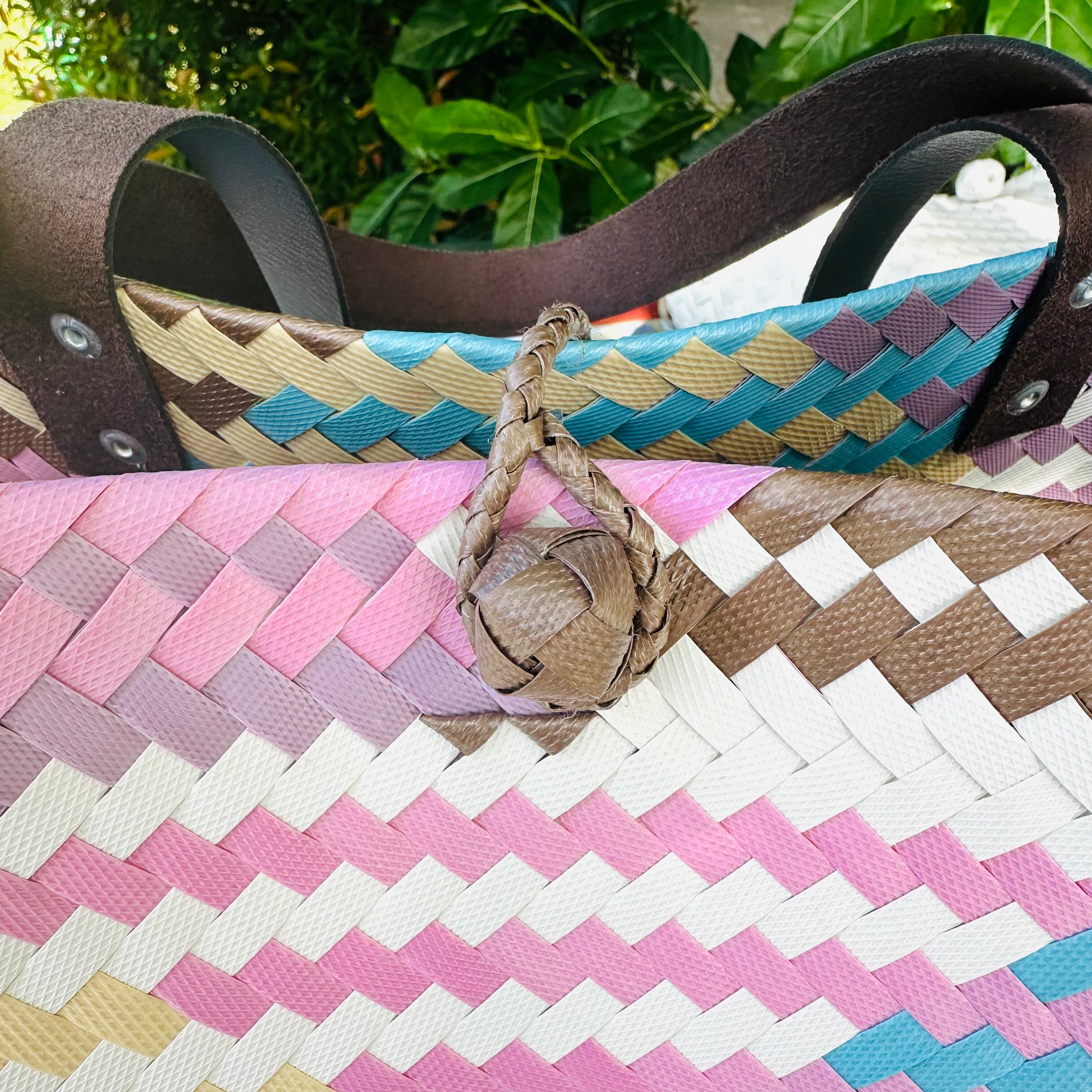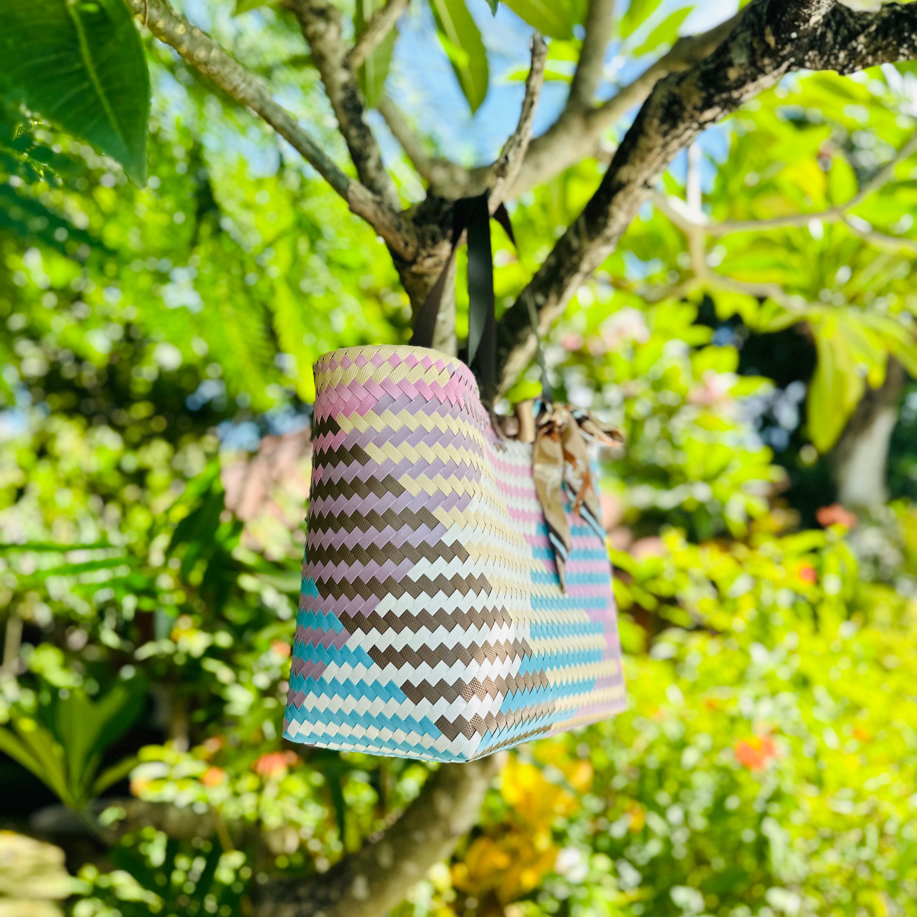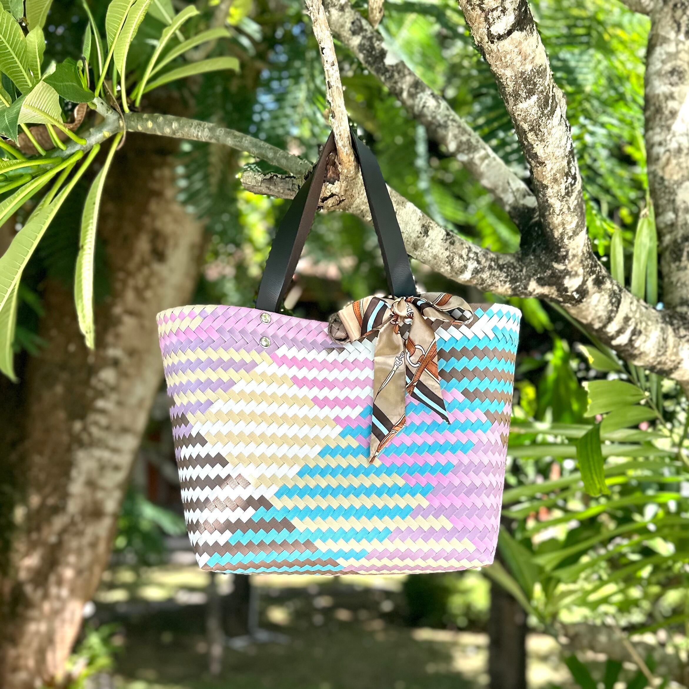 インドネシアでは、市場へ買い物に行く時に女性達が持っていくカゴバッグを普段使いできる可愛いカラーにアレンジしています。